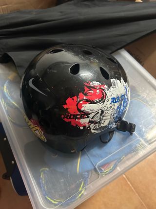 Casco protector de color negro con diseño llamativo. - Diseño con detalles en rojo, blanco y azul. - Ideal para skate, patinete o bicicleta.