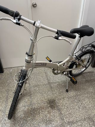 Bicicleta plegable de la marca DAHON, ideal para desplazamientos urbanos o para llevarla contigo a donde vayas. - Color beige. - Ruedas de 20 pulgadas. - Portabultos trasero.