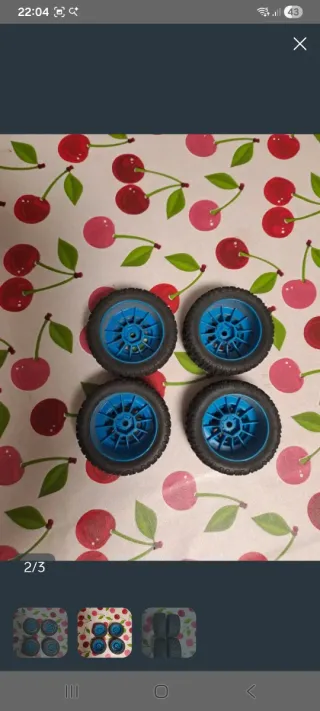 Set de cuatro ruedas para coche radiocontrolado. - Llantas de color azul. - Neumáticos de goma negra.