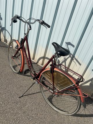 Bicicleta de estilo vintage, ideal para paseos urbanos. - Color burdeos. - Cuadro bajo para facilitar el acceso. - Incluye cesta delantera y portabultos trasero. - Guardabarros delantero y trasero. - Pata de cabra. hay que hacer una puesta a punto