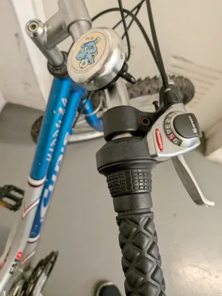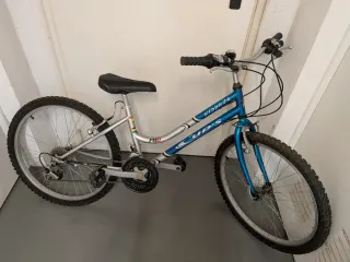 Bicicleta de montaña para niño/juvenil modelo Cup's Kiddy 24. Es una bici más completa que las de iniciación, ideal para paseos por pistas o ciudad. Detalles técnicos: Tamaño: Ruedas de 24 pulgadas (perfecta para estaturas entre 1,35m y 1,50m aprox.). Transmisión: Sistema de cambios con 3 platos y 6 piñones (18 marchas) para subir cuestas sin esfuerzo. Cuadro: Diseño de barra baja en color azul y plata, muy cómodo para subir y bajar. Equipamiento: Frenos V-Brake y neumáticos de montaña con buen taco. Estado: La bicicleta está usada pero estructuralmente perfecta. Tiene algo de óxido superficial por por falta de uso reciente.