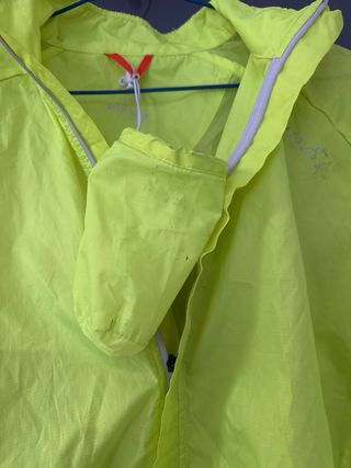 Cortavientos ligero de alta visibilidad para ciclismo. Ideal para protegerse del viento y la lluvia ligera. - Color amarillo neón. - Detalles reflectantes en hombros y parte trasera. - Cierre de cremallera frontal. - Puños y bajo elásticos. - Parte trasera mas larga. Detalle de logo en pecho levantado, ver foto. Por lo demas sin uso.
