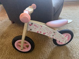 Bicicleta de aprendizaje de madera con un diseño encantador y detalles de dulces. - Marco de madera. - Ruedas con llantas rosas. - Puños y sillín en color rosa. - Decoración con helados, fresas y caramelos.