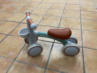 Triciclo de aprendizaje para bebés de 1 a 2 años. Diseñado para fomentar el equilibrio y la coordinación. - Estructura de color verde menta y blanco. - Asiento marrón. - Ruedas de goma. - Cesta delantera.