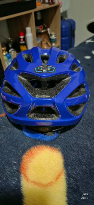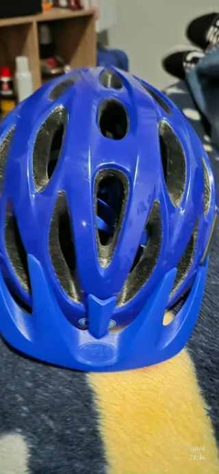 Casco de bicicleta en color azul, diseñado para proteger durante tus paseos. - Diseño ventilado con múltiples aberturas. - Visera integrada. - Marca Bell.