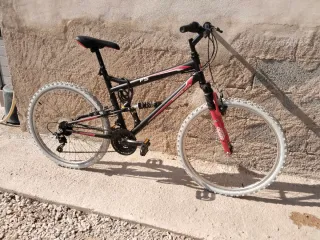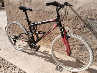 Bicicleta de montaña modelo FS45 en color negro con detalles en rojo y blanco. Ideal para disfrutar de rutas y senderos. También se puede usar de paseo. Necesita un mantenimiento en la transmisión. - Cuadro robusto. - Suspensión delantera y trasera. - Ruedas todoterreno. Ruedas nuevas y cambiadas recientemente. Cubiertas de las ruedas en blanco. Ruedas de 26 pulgadas.