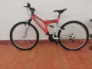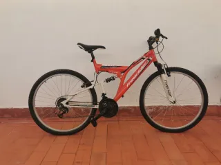 Bicicleta de montaña Freerider en color rojo y blanco. Ideal para disfrutar de rutas. - Cuadro de aluminio. - Suspensión delantera y trasera. - Frenos de disco.