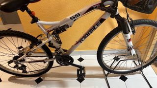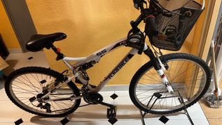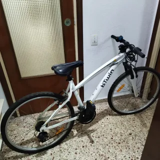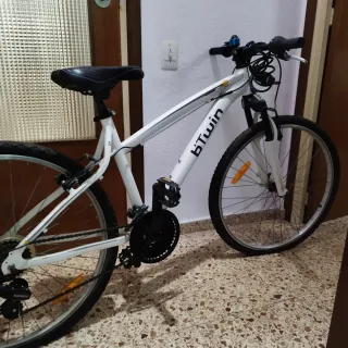 Bicicleta Btwin de color blanco. - Cuadro de aluminio. - Frenos de disco. - Suspensión delantera. - Ruedas de 26 pulgadas.