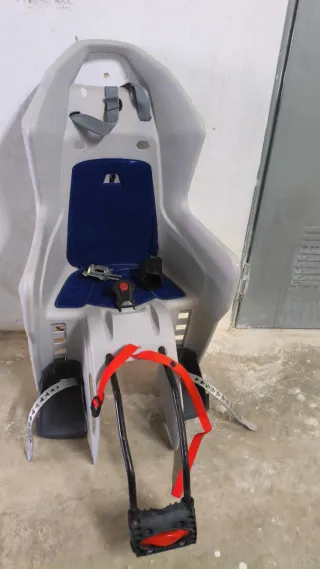 Silla para bicicleta diseñada para transportar niños de forma segura. - Asiento con acolchado azul. - Arnés de seguridad con correas. - Reposapiés con correas de sujeción. - Estructura de plástico gris.