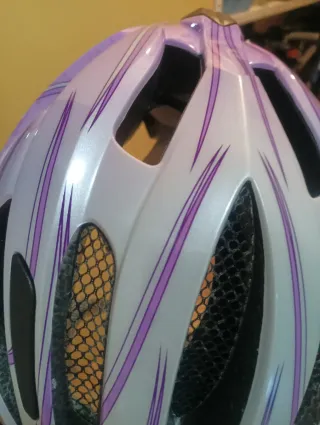 Casco de protección con un diseño moderno y llamativo. - Color rosa y blanco con detalles en morado. - Acolchado interior para mayor comodidad. - Múltiples orificios de ventilación. - Visera integrada.