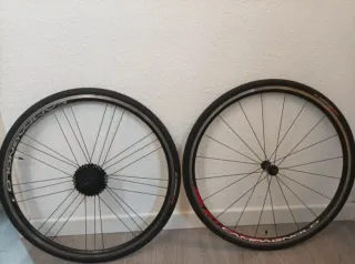 Juego de ruedas Campagnolo para bicicleta. - Rueda delantera con cubierta. - Rueda trasera con cassette.