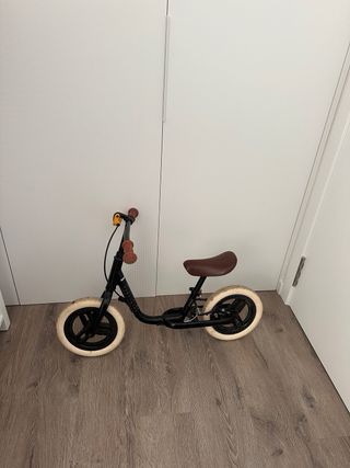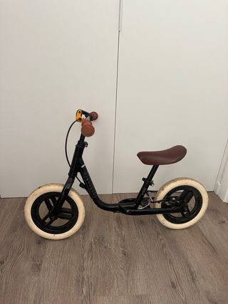 Bicicleta de equilibrio para niños, ideal para aprender a montar. - Marco de color negro. - Ruedas de color blanco. - Asiento marrón. - Puños de color marrón y naranja.