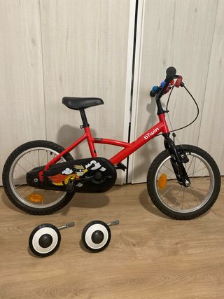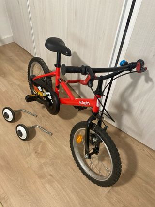 Bicicleta infantil Btwin de color rojo, ideal para los más pequeños. - Ruedines incluidos. - Diseño divertido con personajes.