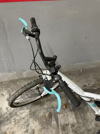 Bicicleta BTWIN de 24 pulgadas, ideal para niños y niñas. - Color blanco con detalles en azul claro. - Ruedas de 24 pulgadas. - Sillín negro. - Manillar con puños de color azul claro.