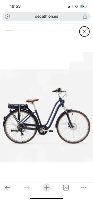 Bicicleta eléctrica de estilo urbano, ideal para desplazamientos diarios. - Color azul marino. - Sillín y puños en tono marrón. - Portaequipajes trasero, incluye alforjas para transporte, bastante capacidad - Ruedas de 28 pulgadas. Literal la he usado UNA VEZ. La vendo por no usar, no espacio y haber cambiado de casa. Está perfecta, nueva. Bici electrica bici urbana La compré en decathlon por 1300