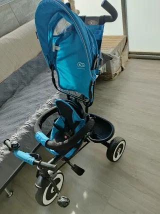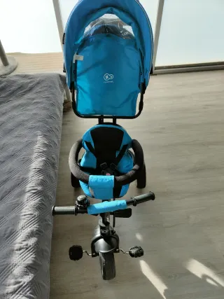 Triciclo Kinderkraft Astor en color turquesa. Diseñado para la comodidad y seguridad. Muy poco uso. - Asiento acolchado con arnés de seguridad. - Capota para proteger del sol. - Reposapiés. - Empuñaduras antideslizantes. - Varias posiciones y modos de llevarlo, más info en las fotos.