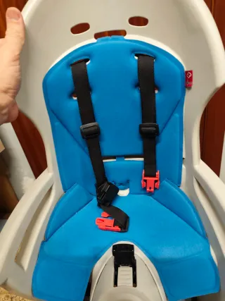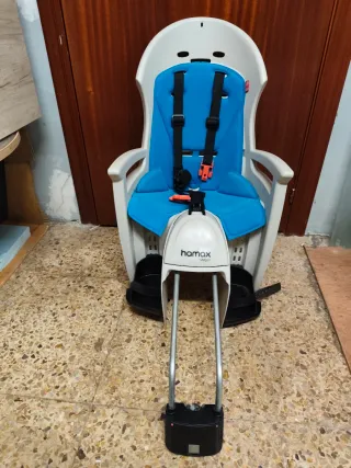 Silla infantil Hamax Smiley para bicicleta. Diseñada para el transporte seguro de niños. - Color azul y gris. - Arnés de seguridad de 3 puntos. - Reposapiés ajustables.