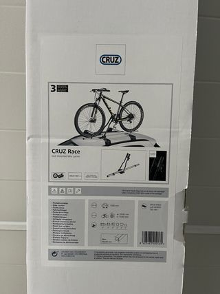 2 Portabicicletas de techo para coche, modelo Cruz Race. Estan para abrir. - Capacidad para 1 bicicleta. - Compatible con cuadros de bicicleta de 25-80 mm. - Compatible con tijas de sillín de 70-90 mm. - Carga máxima de 65x40 mm. Precio por unidad: 50€ Motivo de venta por no uso