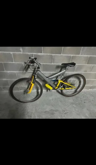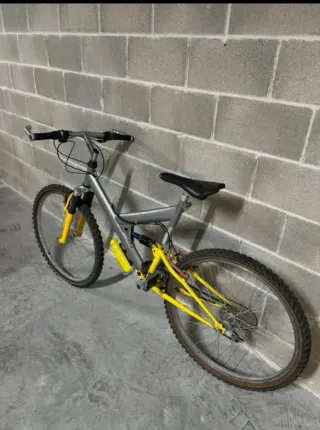 Bicicleta de montaña con doble suspensión. - Cuadro de aluminio. - Horquilla delantera amarilla. - Amortiguador trasero. - Ruedas de 32 pulgadas.