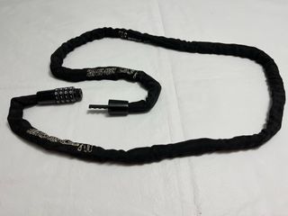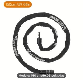 Candado de cadena WEST BIKING para bicicleta. - Longitud: 150 cm / 59.06 pulgadas. - Mecanismo de combinación de 4 dígitos. - No utiliza llave. - Diseño de cadena con funda textil negra. - Usado en buen estado.