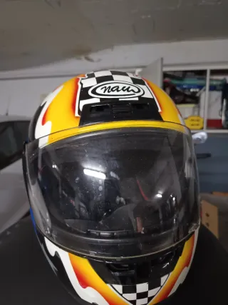 Casco de moto con un diseño llamativo y deportivo. - Diseño de llamas y cuadros. - Visera transparente.