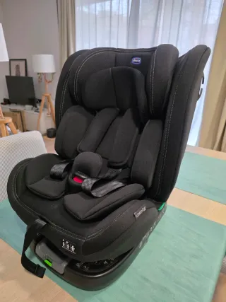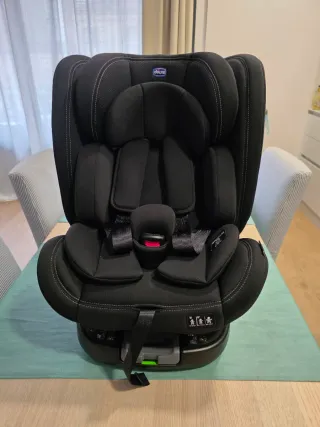 Silla de coche para bebé en color negro, con un diseño acolchado y seguro. - Tapicería de tela. - Cinturón de seguridad de 5 puntos. - Reposacabezas ajustable. - Base con giro de hasta 360° - En su embalaje original. - Precio un poco negociable