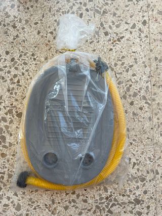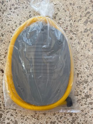 Bomba de pie para inflar artículos deportivos o inflables. Está nueva, sin usar, en su embalaje original. - Bomba de pie manual. - Manguera amarilla incluida. - Base gris.