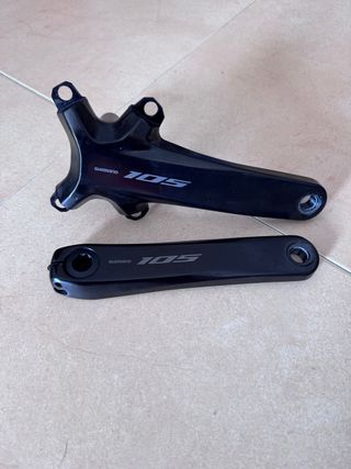 Bielas Shimano 105 FC-R7100 en color negro. - Diseño moderno y elegante. - Fabricadas en aluminio. - Compatibles con sistemas de 12 velocidades. - 170 mm - Originales, nada de replicas, esta desmontada de un grupo shimano 105 di2 Usadas 3 salidas