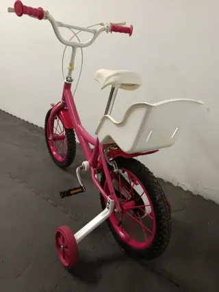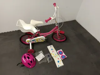 Bicicleta infantil Nancy de color rosa, ideal para los más pequeños. Incluye un casco a juego para mayor seguridad. - Bicicleta de color rosa. - Incluye casco de protección. - Ruedines de apoyo. - sillita para muñecas. - instrucciones, pegatinas y dos herramientas.