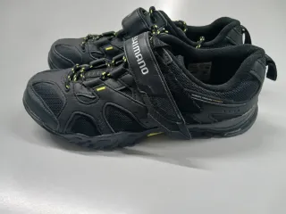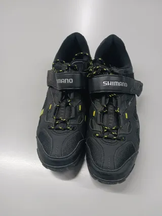 Zapatillas de ciclismo de montaña Shimano, nuevas y listas para usar. - Cierre de velcro y cordones. - Diseño en color negro con detalles amarillos. - Suela con tacos para mejor agarre.