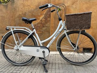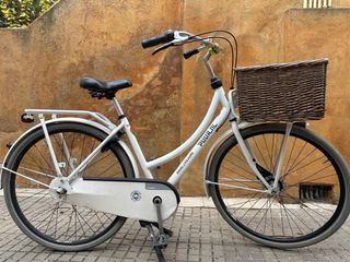 Bicicleta urbana de color blanco, ideal para paseos y recados. - Cesta delantera de mimbre. - Guardabarros delantero y trasero. - Portaequipajes trasero. - Cadena protegida.