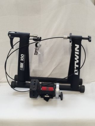 Conjunto completo para disfrutar del ciclismo sin salir de casa. Consta de un rodillo de la marca B-Twin, en perfecto estado y con muy poco uso. Una cubierta especial para rodillo, marca TACX Un eje trasero de liberación rápida, especial para el soporte del rodillo. Y un soporte antideslizante para la rueda delantera. Se vende por cambio de Hobbie.
