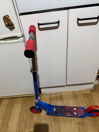 Patinete infantil con diseño de Spiderman de Marvel. - Base antideslizante con imagen de Spiderman. - Ruedas rojas. - Estructura de color azul. - estado muy bien