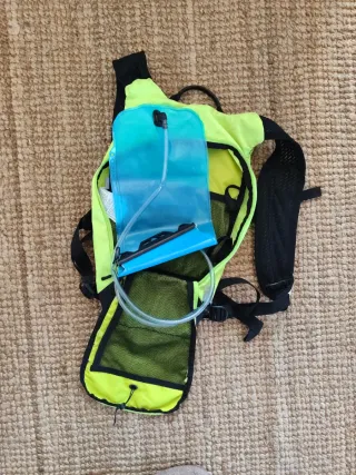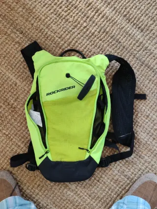 Mochila de hidratación Rockrider en color verde lima y negro. Perfecta para actividades al aire libre. - Diseño ligero y ergonómico. - Compartimento principal con cremallera. - Bolsillos laterales de malla. - Tirantes ajustables y acolchados.