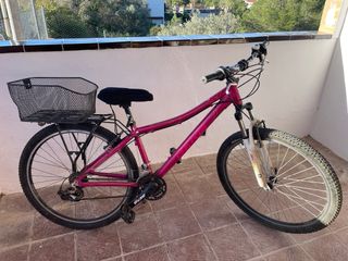 Bicicleta de montaña de color rosa, ideal para adultos. Cuenta con una cesta delantera y un portabultos trasero. - Cesta de malla negra. - Portabultos trasero. - Sillín negro. - Ruedas de 26 pulgadas.