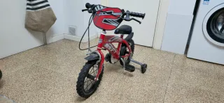 Bicicleta de 12 pulgadas para niños, ideal para iniciarse en el ciclismo. - Color rojo con detalles gráficos. - Ruedines de apoyo incluidos. - Freno delantero y trasero.