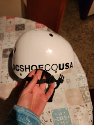 Casco de la marca DC Shoes en color blanco. Ideal para patinar o montar en bicicleta. - Diseño deportivo. - Cierre de correa ajustable. Algun rayajo en la parte superior pero por dentro esta bien.