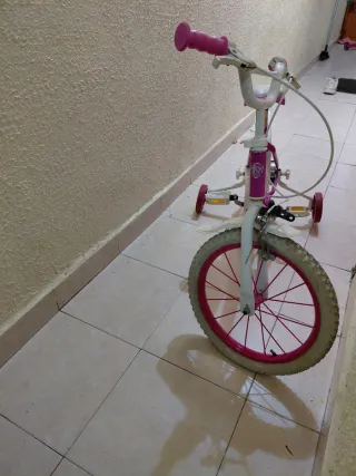 Bicicleta infantil de color blanco y azul de 16’’ (de 4 a 8 años), ideal para los primeros paseos. Está en perfecto estado, se ha usado muy poco. - Ruedines incluidos para mayor estabilidad. - Diseño con detalles de astronauta en el guardabarros. - Manillar con puños de seguridad y timbre.