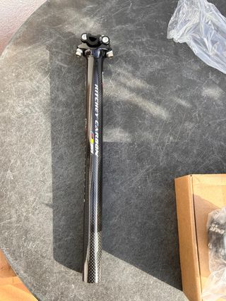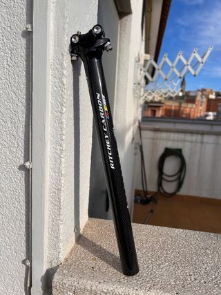 Tija de sillín Ritchey Carbon de 27.2 mm. 195 gr. Largo 350mm Nueva a estrenar NO NEGOCIABLE - Fabricada en carbono. - Diseño ligero y resistente. - Acabado en negro mate con detalles en rojo y blanco.