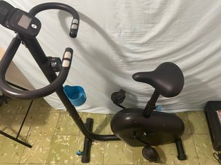 Bicicleta estática Domyos modelo 120, diseñada para entrenamientos en casa. Cuenta con un soporte para botellín y ruedas para facilitar su movilidad. - Manillar con agarres ergonómicos. - Sillín ajustable en altura. - Pantalla digital para seguimiento de ejercicio.