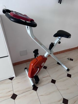 Bicicleta estática plegable de color blanco y rojo, con detalles en negro. Ideal para hacer ejercicio en casa. - Diseño plegable para fácil almacenamiento. - Manillar ergonómico con agarres acolchados. - Sillín ajustable en altura. - Pedales con correas de sujeción.
