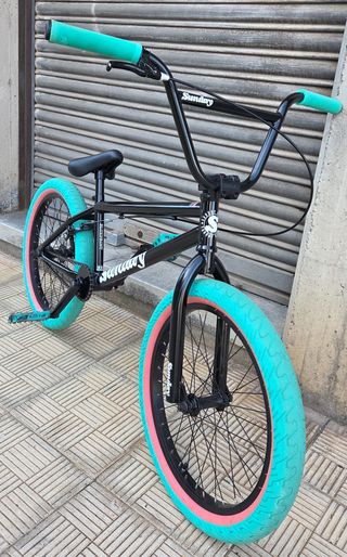 Bicicleta BMX marca Sunday en buen estado, ideal para quienes buscan iniciarse en el mundo del BMX o para quienes ya tienen experiencia. - Cuadro negro. - Ruedas de color turquesa con detalles en rosa. - Puños de color turquesa.