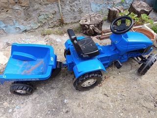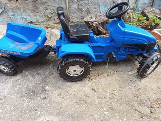 Tractor de pedales Rolly Kid en color azul, perfecto para que los más pequeños disfruten al aire libre. Incluye un remolque. - Diseño robusto y llamativo. - Ruedas grandes para todo tipo de terrenos. - Volante para dirigir el tractor.