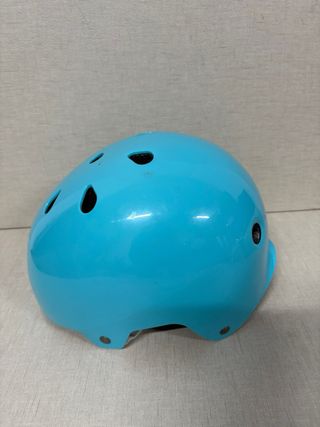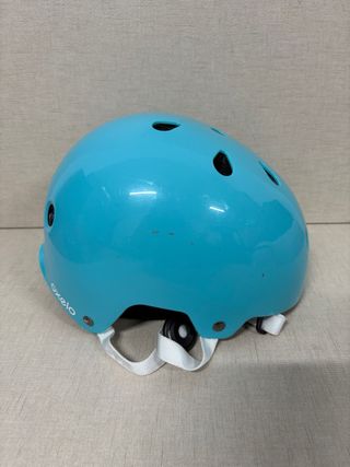Casco de protección en color azul, ideal para actividades deportivas. - Marca: Oxelo - Diseño ventilado con orificios. - Correa de ajuste blanca.