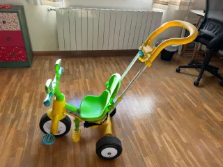 Triciclo infantil con un diseño divertido y llamativo. - Asiento ergonómico verde. - Mango de empuje amarillo. - Ruedas resistentes.