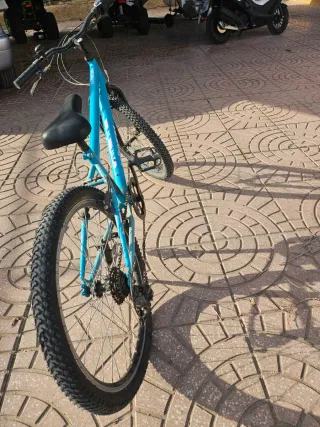 Bicicleta de montaña en buen pero usado estado, ideal para paseos y rutas. - Cuadro blanco con detalles en azul. - Manillar negro. - Ruedas de montaña.