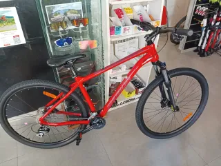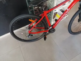 Bicicleta de montaña en color rojo, ideal para disfrutar de rutas y senderos. - Cuadro de aluminio. - Ruedas de 29 pulgadas. - Frenos de disco. - Suspensión delantera.