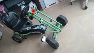 Coche a pedales de color verde y negro, diseñado para niños. - Estructura metálica. - Ruedas de goma. - Volante. - Pedales.