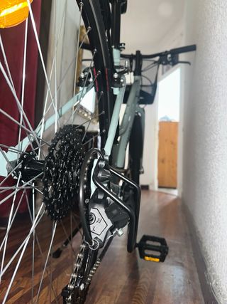 Bicicleta urbana en color menta, ideal para desplazamientos diarios. - Cuadro de aluminio ligero. - Frenos de disco. - Cambio Shimano de 7 velocidades. - Portabultos trasero.
