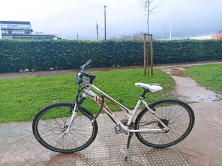 Bicicleta en color blanco con detalles en rojo y negro. Ideal para paseos y rutas. - Cuadro de aluminio. - Suspensión delantera. - Frenos de disco. - Ruedas de 26 pulgadas.